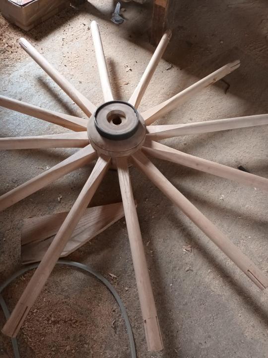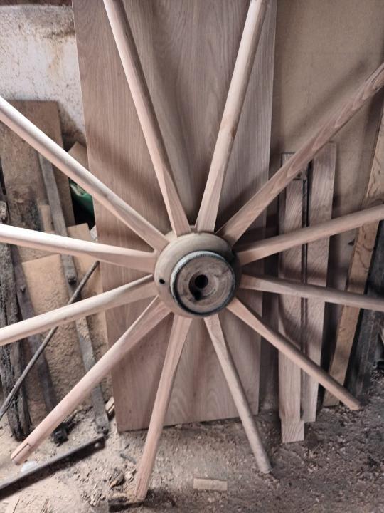 Il en a refait les roues en bois et samedi, il va en réaliser le cerclage en fer.